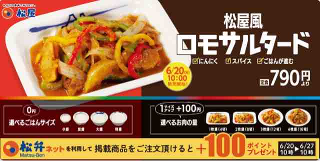 松屋で新メニューを松弁ネットで注文すると100ポイントもらえるキャンペーンを実施するのが恒例だ。このキャンペーン、今回の新メニュー対象商品は「"松屋風"ロモサルタード」だ。