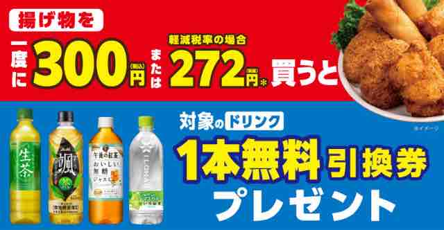 揚げ物を税込300円または税抜272円買う毎に、対象ドリンクの中から1本を無料でもらうことができる。