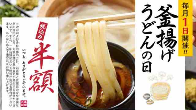 讃岐うどんの丸亀製麺で、毎月一日に釜揚げうどん全サイズが半額になる釜揚げうどんの日を実施している。この釜揚げうどんの日は毎月一日の一回のみ実施されているが、釜揚げうどんをお得に食べることができるので、店内が混み合うほどの人気だ。