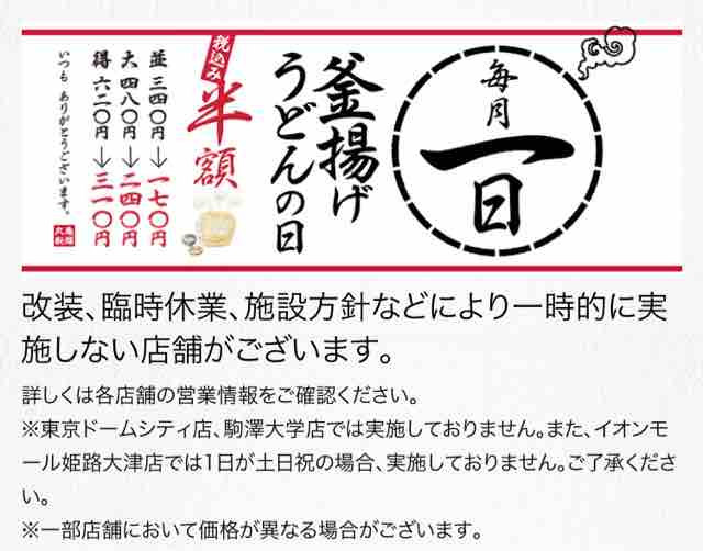 ・毎月一日釜揚げうどんの日は釜揚げうどんの並・大・得が半額になる