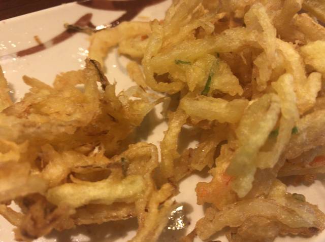 天ぷらでボリューム感があるのは野菜かき揚げだ。170円でかなりの大きさで食べ応えがある。野菜はほんのり甘味があって美味しい。塩を少しかけると、野菜の甘味と塩味のバランスがちょうど良く、量も大石美味しさも満足できておススメの天ぷらだ。