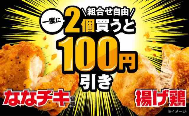 コンビニエンスストアのセブンイレブンで、ななチキ各種、揚げ鶏を一度に2個(組み合わせ自由)買うと、100円お得に提供されるキャンペーンが実施されている。