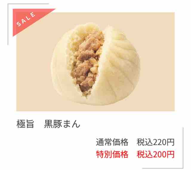 極旨黒豚まんは大きめに肉をカットしてゴロっとした肉食感を出し、鹿児島県産黒豚によりジューシーで旨みと甘みが強く、ずっしりとした重厚感を感じられるよう仕立てている。淡路島産たまねぎ100%使用によりみずみずしい甘さを引き出している。中華まん全品20円引きとなり、こちらの極旨黒豚まんも対象になる。