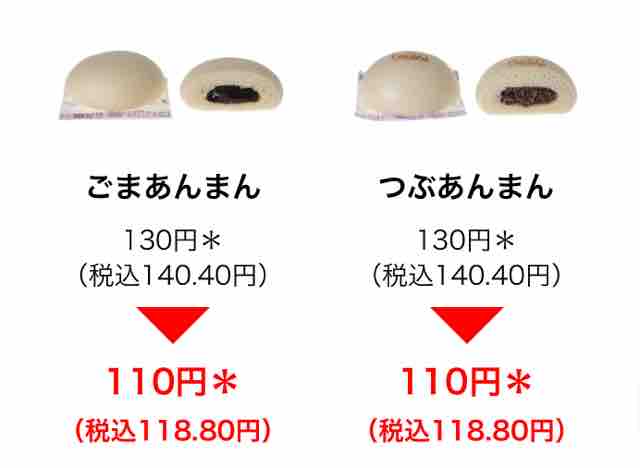 ・つぶあんまん 130円(税込140.40円)→110円(税込118.80円)