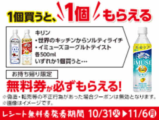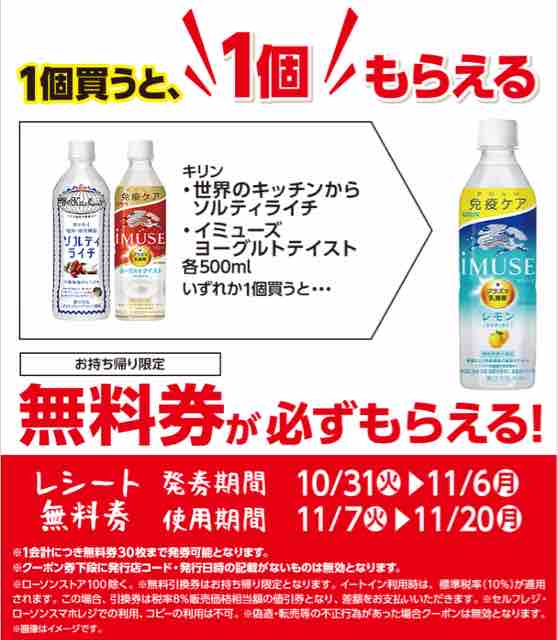 ローソンで「キリン iMUSE ヨーグルトテイスト 500ml」または「キリン 世界のキッチンからソルティライチ 500ml」を1本買うと、同じ飲料メーカーの「キリン iMUSE レモン 500ml」の無料引換券をもれなくもらえる。無料引換券は、1本ごとに1枚もらえる。1本買うと無料券でもう1本もらえるのでお得だ。