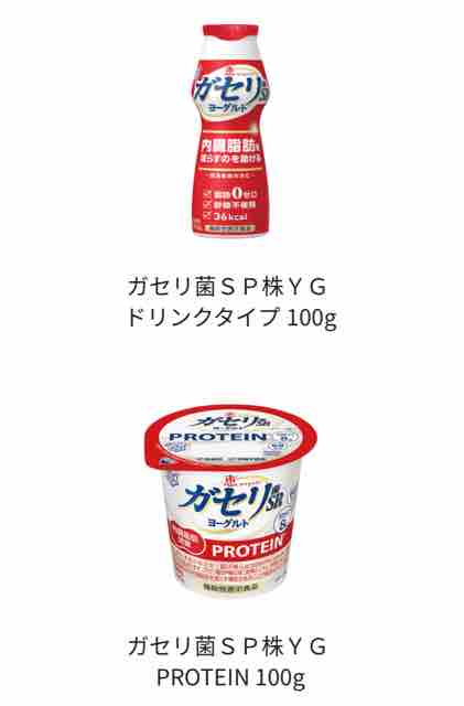 無料引換券がもらえる対象の商品は「ガセリ菌SP株YG ドリンクタイプ 100g」または「ガセリ菌SP株YG PROTEIN 100g」。