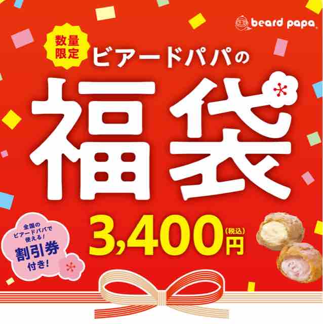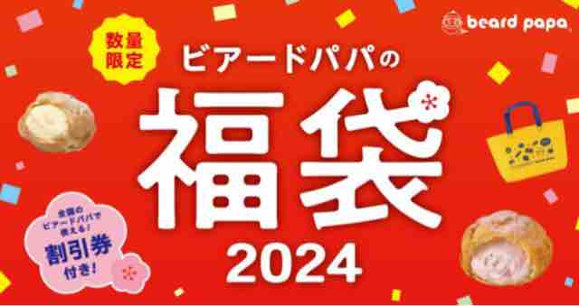 シュークリーム専門店のビアードパパから2024年福袋が数量限定で販売される。店舗によって取り扱いがない場合もあるが、基本的には2,600円と3,400円(どちらも税込)2種の福袋が販売され、無くなり次第終了となる。例年では店舗によって他の種類の福袋が販売されている場合もある。