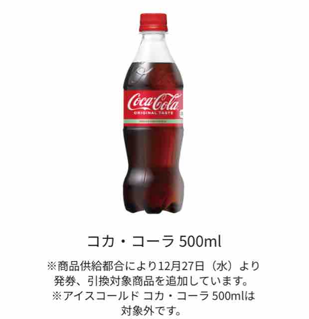コンビニエンスストアのセブンイレブンで、「コカ・コーラ500ml」「コカ・コーラ ゼロカフェイン 500ml」「コカ・コーラ プラス 470ml」いずれか1本を買うと、同商品いずれか1本と交換できる無料引換券がもらえるキャンペーンが始まっている。
