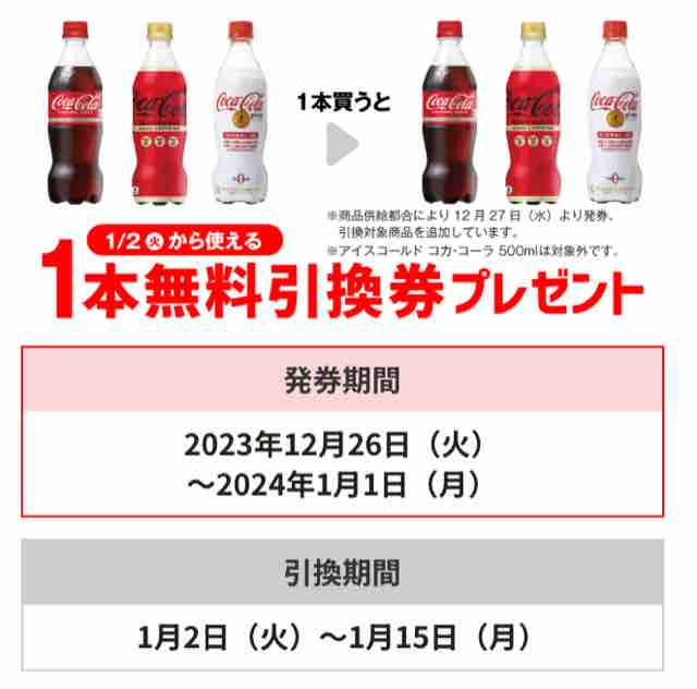 「コカ・コーラ500ml」「コカ・コーラ ゼロカフェイン 500ml」「コカ・コーラ プラス 470ml」いずれか1本買うと、同商品いずれか1本の無料引換券をもれなくもらえる。ドリンク無料券引換券は、対象商品1個購入につき1枚発行される。