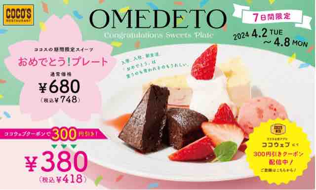 期間限定スイーツ「おめでとう!プレート」は通常価格680円(税込748円)のところ、ココウェブのクーポンを使用すれば300円引きの380円(税込418円)で提供される。お祝いにぴったりな可愛いらしいデザートだ。1週間限定の期間限定スイーツ。