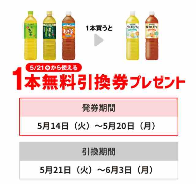 コンビニエンスストアのセブンイレブンで、対象の飲料を買うと、同メーカーのペットボトル飲料の無料引換券がもらえるキャンペーンが始まっている。無料引換券がもらえる購入対象商品は、「伊藤園 お~いお茶 緑茶 1L」「伊藤園 お~いお茶 濃い茶 1L」「伊藤園 健康ミネラルむぎ茶 1L」。無料引換券の対象商品は、「伊藤園 ジャスミンティー 1L 」「伊藤園 ルイボスティー 1L 」となる。