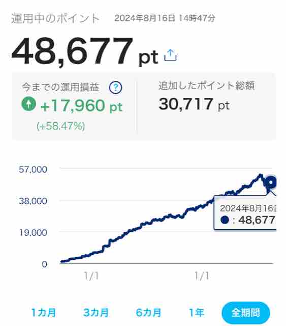 今までの運用損益+17,960pt(+58.47%)