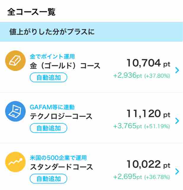 かなり運用実績だ。先日の大幅な株価下落の影響で少なくなっているが、長期で見ると右肩上がりで増えている。ポイント運用のコース振り分けは以下の通り。