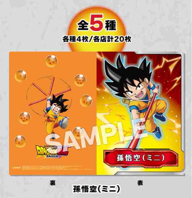 クリアファイル全5種は、ドラゴンボールDAIMA(ダイマ)に登場するお馴染みの5人キャラクターが表と裏に描かれている。ドラゴンボール関連のグッズは人気が予想されるため、欲しい方は早めにもらいにいこう。