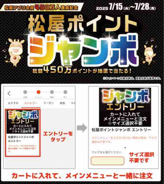 牛丼チェーン店の松屋で、松屋アプリ会員数450万人達成記念として抽選で総額450万ポイントが当たる「松屋ポイントジャンボ2025」が松屋アプリ限定で実施されている。