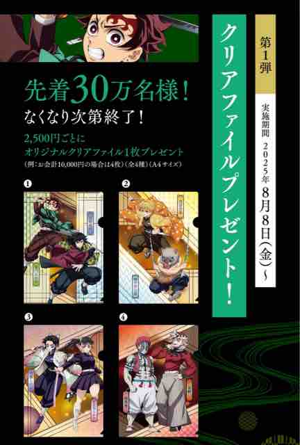 回転寿司チェーン店のくら寿司で、鬼滅の刃とのコラボキャンペーンが始まっている。キャンペーンはお会計2,500円以上(税込)購入で、鬼滅の刃のクリアファイル全4種のうち、1部をもらうことができる。先着30万名様にプレゼントで早い者勝ちとなる。