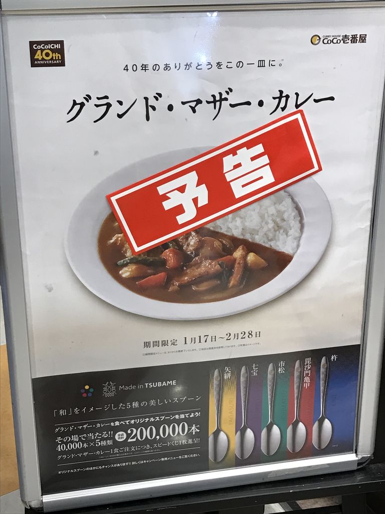 ココイチで一番美味しいと思うカレーがグランドマザーカレー。定番メニューにして欲しいが期間限定メニュー。このグランドマザーカレーが始まるとあって待ち遠しい。スピードくじで当たればスプーンがその場でもらえるキャンペーンも実施される。