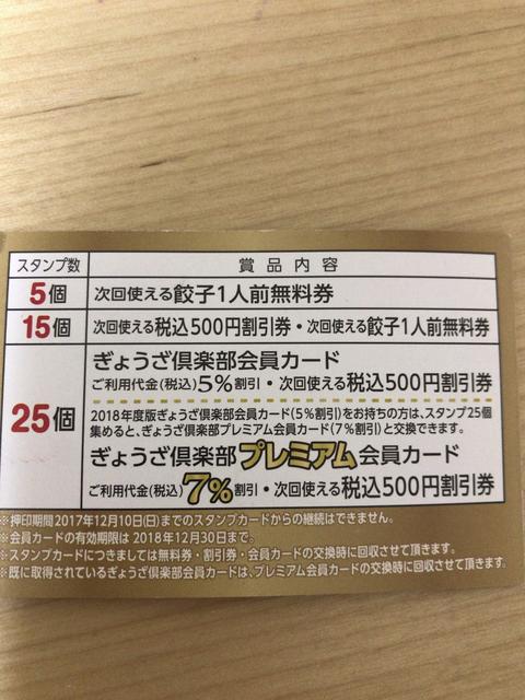 通常スタンプ1個押印は会計500円、2倍キャンペーンもあるかもしれないが、普通にスタンプを25個集めるとしたら500円×25個=12,500円かかる。それで会計5%割引になるぎょうざ倶楽部会員カードをもらえるならいい。会員カードの有効期間は2018年12月30日まであるので、2018年中は何度も使用することができる。
