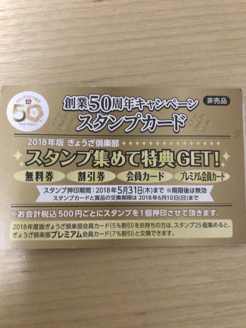 餃子の王将の創業50周年キャンペーン第2弾のお知らせがきた。第1弾は2017年7月1日から始まり、スタンプを集めるとぎょうざ倶楽部会員カードや数量限定の創業50周年の記念ロゴ入り食器、限定ストラップなどがもらえるキャンペーンだった。