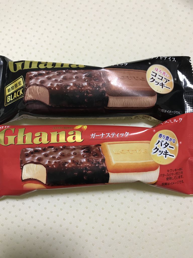大物はガーナ2層仕立て、ガーナ2層仕立てブラック、ガーナスティックマルチ、小物はガーナスティック、ガーナスティックブラック、ガーナ大人の生チョコ。ガーナ2層仕立てもガーナスティックもブラックがあり、ブラックは中に入っているアイスがバニラではなくビターなチョコアイスになっており、チョコアイスも楽しめるのがいい。