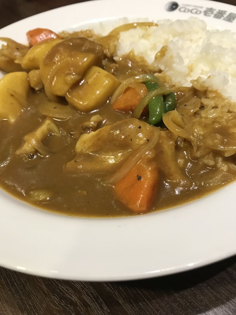 スパイスが効いているけどそれほど辛くはなく、何と言っても一つ一つの具が大きい。じゃがいもはゴロゴロ入っていて、たまねぎも厚切り、にんじん、いんげんも入っている。豚肉は香ばしく厚切りになっていて、とても食べ応えがあります。