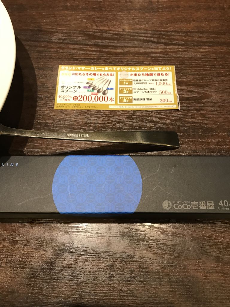 食事が来るまでの間に店員さんがその場で当たるスピードくじが入った箱を持ってきた。箱の中からくじを1枚引くと和をイメージした5種の美しいスプーンのうち、杵のスプーンが当たりました!40,000本×5種類で全店合計200,000本当たるため、グランドマザーカレー1食注文で引けるくじは当たるチャンスが大いにありますね。
