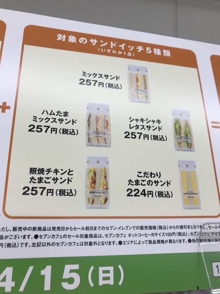 対象サンドイッチは5種類でミックスサンド税込257円、ハムたまミックスサンド税込257円、シャキシャキレタスサンド税込257円、照焼チキンとたまごサンド税込257円、こだわりたまごのサンド税込224円。