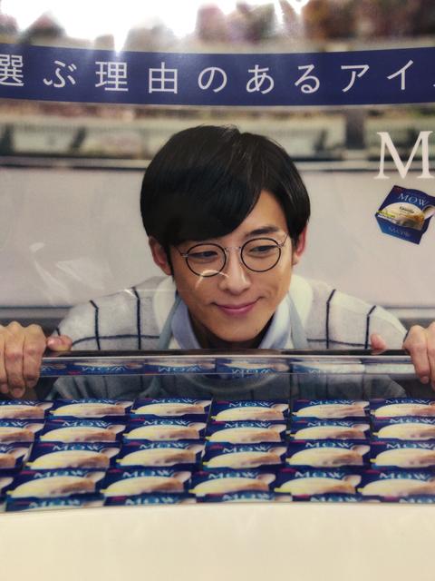 高橋一生は眼鏡をかけており、真ん中に座ってアイスのショーケースに両手をかけている。MOWが綺麗に並べられているのを微笑みながら眺めているシーンだ。服装はCMと同じでエプロン姿の高橋店長の格好だ。