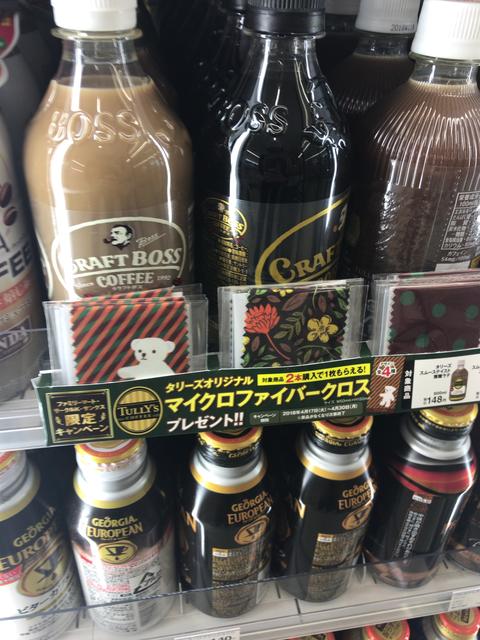 ファミリーマートへ行くと対象の伊藤園タリーズコーヒー商品を2本買うとタリーズオリジナルマイクロファイバークロスがもらえるキャンペーンを実施していた。POPにはファミリーマート・サークルK・サンクス限定キャンペーンと書かれているが、ファミリーマートのホームページにはこのキャンペーン情報は掲載されていない。