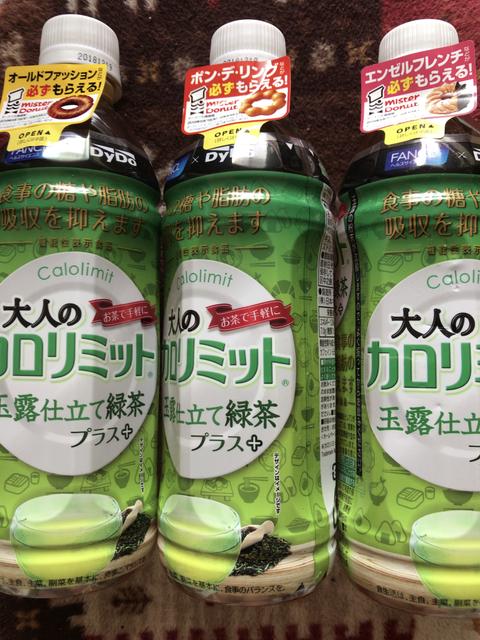 シールを3枚持ってミスドへ行き、対象のドーナツを3個全て取り、レジに行ってシールを3枚を出した。1度に3枚交換は大丈夫かなと心配したが問題なく引換でき、無事にドーナツを食べることができた。そしてドーナツを食べた後は大人のカロリミット緑茶を飲んで満足だ。