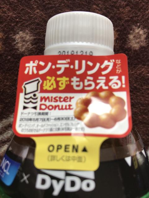 マックスバリュに行ったとき、ダイドー大人のカロリミット緑茶にシールが貼られていた。シールを見るとお馴染みのミスドのマークだ。シールは3種類あって、そこにはポン・デ・リングなどが必ずもらえる!他はオールドファッション、エンゼルフレンチがもらえると書かれており、ドーナツの写真も写っている。