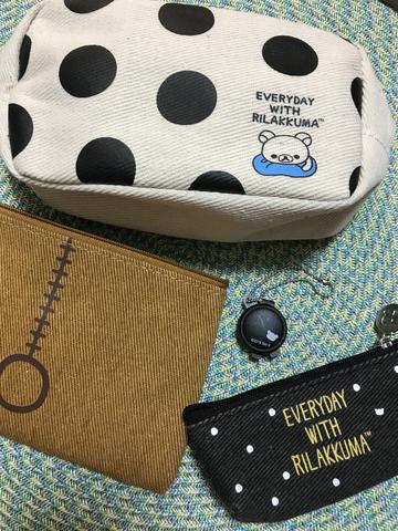 マチなしポーチはリラックマの顏が全面に描かれている。色は茶色だ。裏側にはファスナーと尻尾が描かれている。サイズはタテ10×ヨコ15cm。ちびポーチは表にクッションにうもれるリラックマが描かれている。ポーチとクッションのドット柄にはよく見るとリラックマの耳が付いている柄がある。リラックマの側にはコーヒーが置かれている。裏にはEVERYDAY WITH RILAKKUMAと書かれている。色は黒色を基調としており、ドット柄は白色。サイズはタテ4×ヨコ11×マチ2cm。ポーチは全てファスナーにRの文字が書かれている。