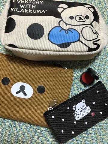 リラックマ新生活4点セットはポーチが3つに携帯用朱肉。ポーチはマチ付きポーチ、マチなしポーチ、ちびポーチ。マチ付きポーチは布生地で厚みがあり、リラックマがクッションに肘を付いて横になっている。だいぶくつろいでいるな、リラックマ。裏側を見るとリラックマがクッションにうつぶせになっている。寝てばっかりだな、リラックマ。でもかわいくて癒される。表にはEVERYDAY WITH RILAKKUMAと書かれている。表、裏ともに黒のドット柄だ。サイズはタテ8.5×ヨコ15×マチ5cm。