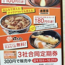 吉野家、はなまるうどん、ガストの3社合同定期券が300円で2018年8月27日(月)~10月14日(日)の期間で販売している。定期券を使うと吉野家は1食につき80円引き、はなまるはうどん1杯ごとに天ぷら1品無料、ガストは1会計で100円引きとなる。使用期間は2018年9月10日(月)~10月21 ...