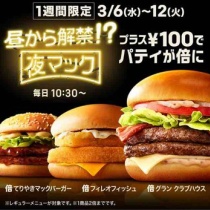 【キャンペーン速報】倍バーガーの夜マックが始まって1周年!昼から拡大した時間でプラス100円でパティ倍!2019年3/6(水)~