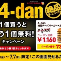 【キャンペーン速報】ロッテリアで肉祭り!4-dan絶品チーズバーガーを1個買うともう1個無料!2019年7/5(金)~