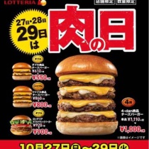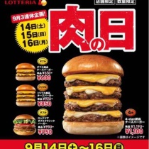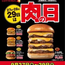 ハンバーガーチェーン店のロッテリアで、毎月27日~29日に実施している肉(ニク)の日を9月の3連休も実施し、ボリューム満点のハンバーガーをお得な価格で提供する。今回も前回9/14(土)~16(月・祝)に引き続き、4-dan絶品チーズバーガーを含めたボリュームバーガーがお得に食べ ...