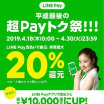 LINE Payが対象のコンビニ、ドラッグストア、家電量販店、飲食店、ファッション店のコード支払いやオンライン支払、請求書支払いで、支払い金額の20%をLINE Pay残高に還元する平成最後の超Payトク祭キャンペーンを開始する。キャンペーン期間は2019年4月18日(木)0:00~4月30 ...
